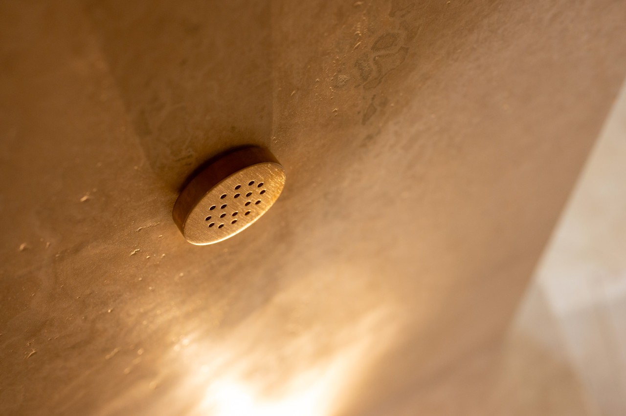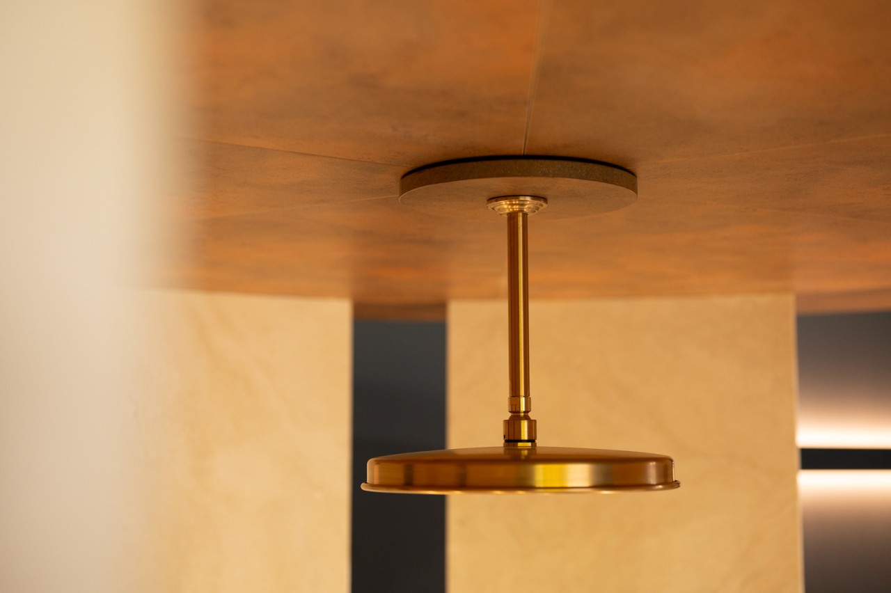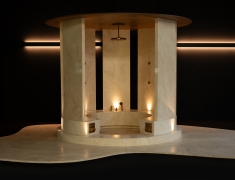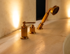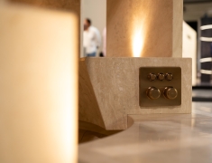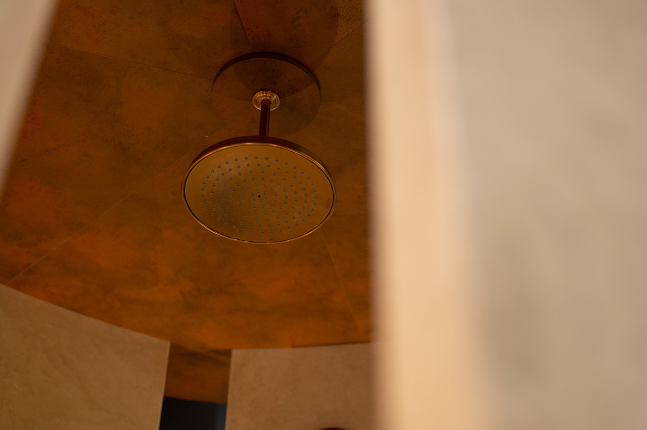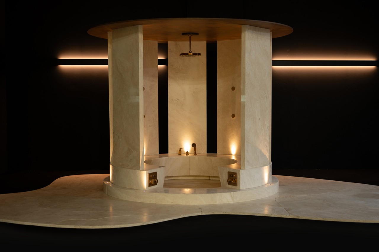 Di grande impatto ad esempio il grande soffione che libera zampilli d’acqua a terra, sul piano marmoreo che come un tappeto circonda l’Impluvium. Lo spazio tra una lastra e l’altra permette all’acqua di mescolarsi con l’aria. Gli accessori in ottone rendono interattivo ogni elemento della struttura: dai diffusori di suono ai comandi per il soffione incastonati nella seduta circolare. Un sistema armonico di piccole luci illumina poi gentilmente la pietra bagnata. Nella funzione di questa struttura riecheggia chiaro l’Impluvium romano, che a inizio anni ’90 è stato riportato in vita nelle SPA più scenografiche d’Italia. Qui, il piano di raccolta è un lago di marmo chiaro che si estende oltre la struttura e termina ai suoi confini con uno smusso lievemente arrotondato. Anche gli accessori sono stati realizzati appositamente per questo appuntamento di Marmomac, vedi ad esempio la rubinetteria in bronzo della ditta Gessi ed il tetto di bronzo.