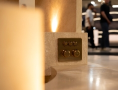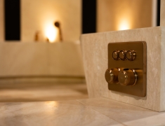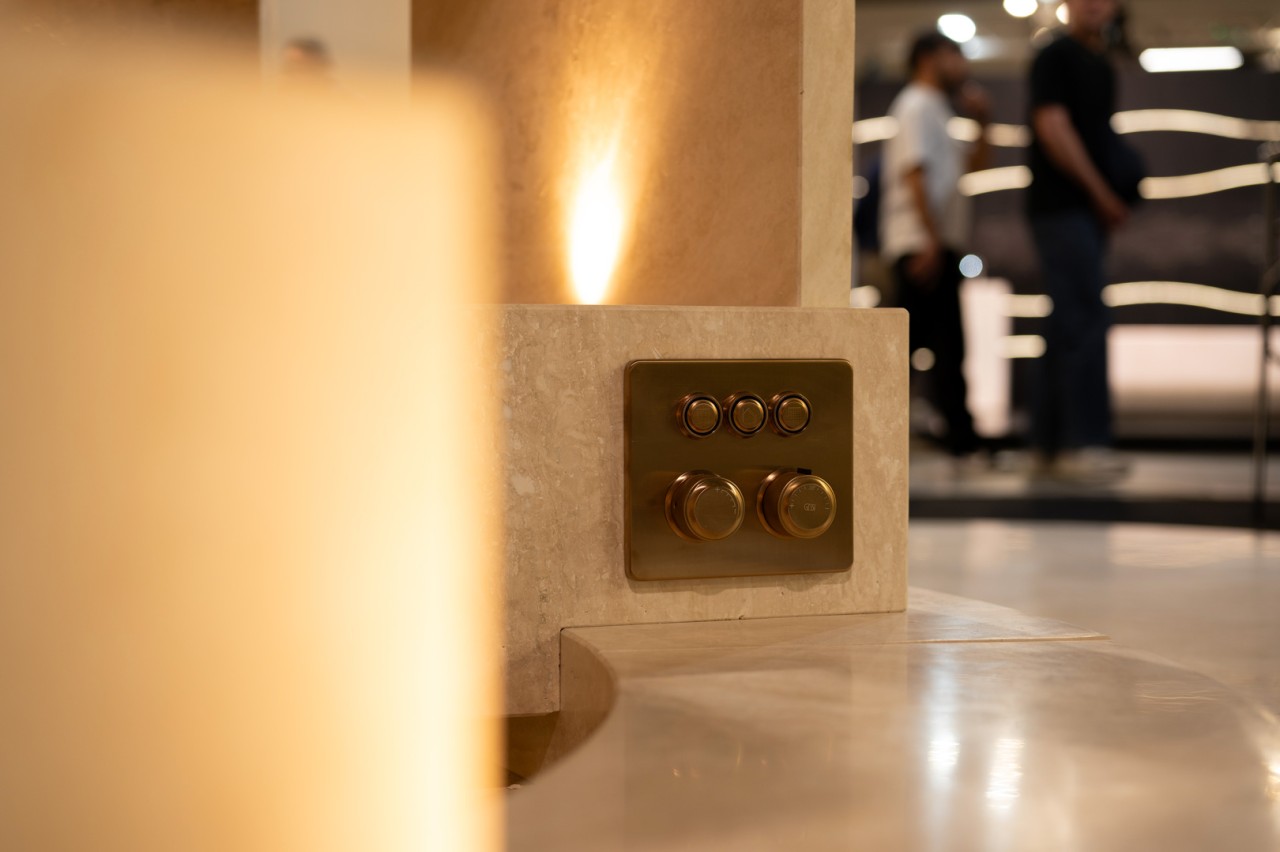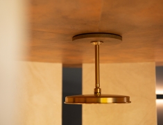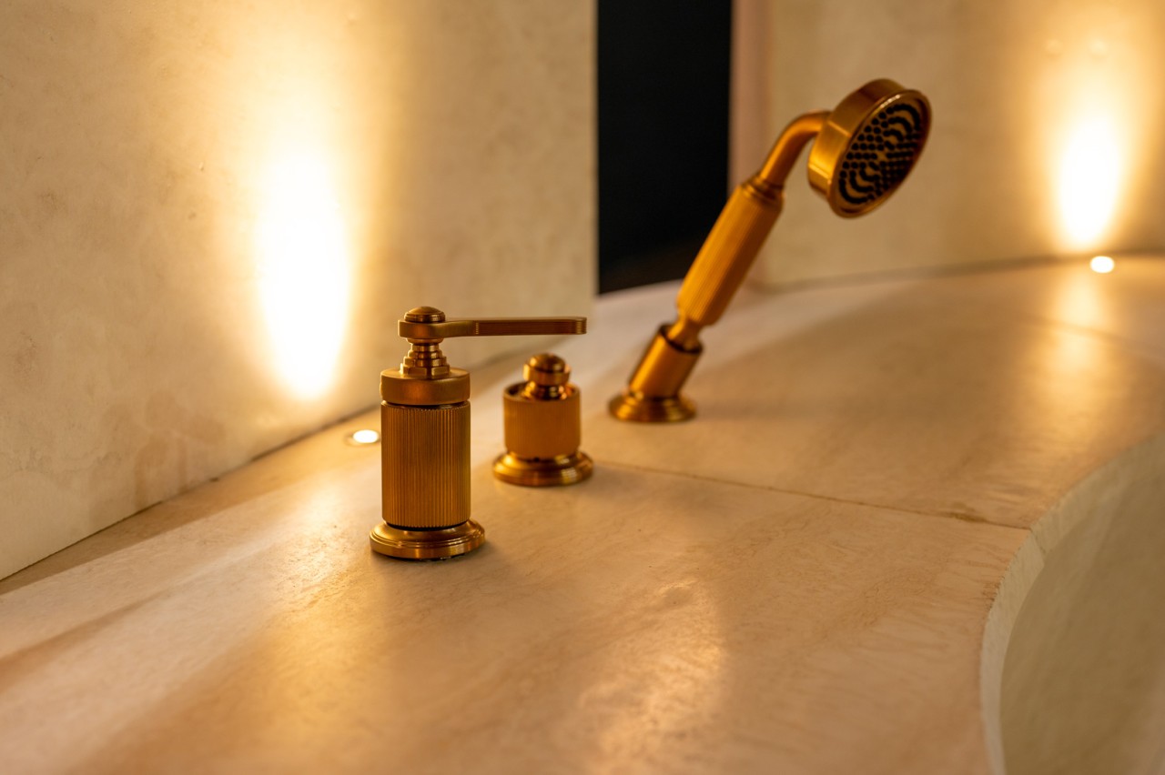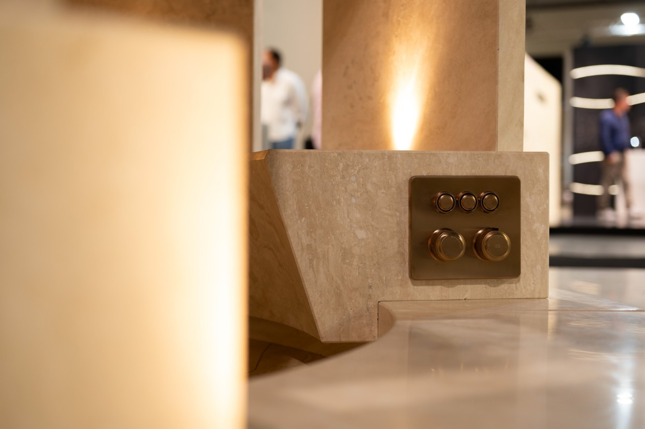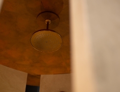 Di grande impatto ad esempio il grande soffione che libera zampilli d’acqua a terra, sul piano marmoreo che come un tappeto circonda l’Impluvium. Lo spazio tra una lastra e l’altra permette all’acqua di mescolarsi con l’aria. Gli accessori in ottone rendono interattivo ogni elemento della struttura: dai diffusori di suono ai comandi per il soffione incastonati nella seduta circolare. Un sistema armonico di piccole luci illumina poi gentilmente la pietra bagnata. Nella funzione di questa struttura riecheggia chiaro l’Impluvium romano, che a inizio anni ’90 è stato riportato in vita nelle SPA più scenografiche d’Italia. Qui, il piano di raccolta è un lago di marmo chiaro che si estende oltre la struttura e termina ai suoi confini con uno smusso lievemente arrotondato. Anche gli accessori sono stati realizzati appositamente per questo appuntamento di Marmomac, vedi ad esempio la rubinetteria in bronzo della ditta Gessi ed il tetto di bronzo.