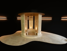 La struttura circolare si sviluppa in altezza e accoglie gli ospiti sulla sua seduta generosa tra luci e ombre.