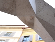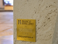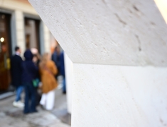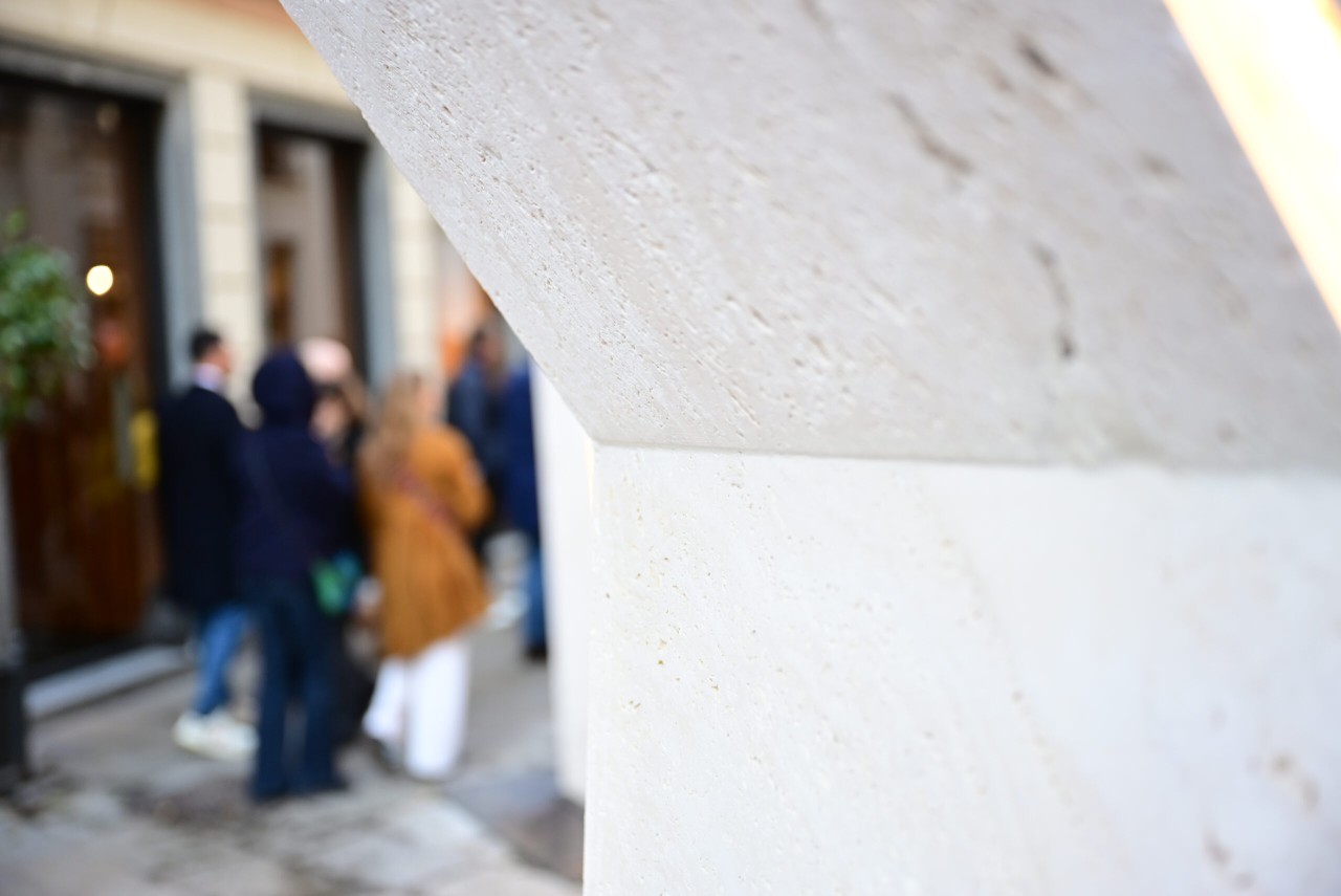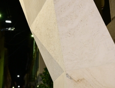 Elemento centrale dell’installazione è stato il nostro Bianco Sibillino, un pregiato travertino bianco apprezzato per la sua eleganza e versatilità. Materiale d’eccezione, si presta a molteplici lavorazioni e risulta ideale per progetti unici e senza tempo.